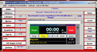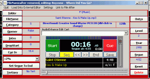 Setting of intro, level, cue in, opener, seque point year of release and refinement to artist/track details takes place here. This is also where deleting/renaming of tracks takes place.