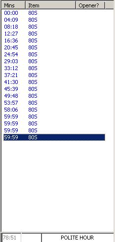 In this new clock, highlight the POLITE marker we put at around :30 by highlighting it and hitting the DELETE key. We are back to an hour just full of 80s songs, with a healthy overschedule: